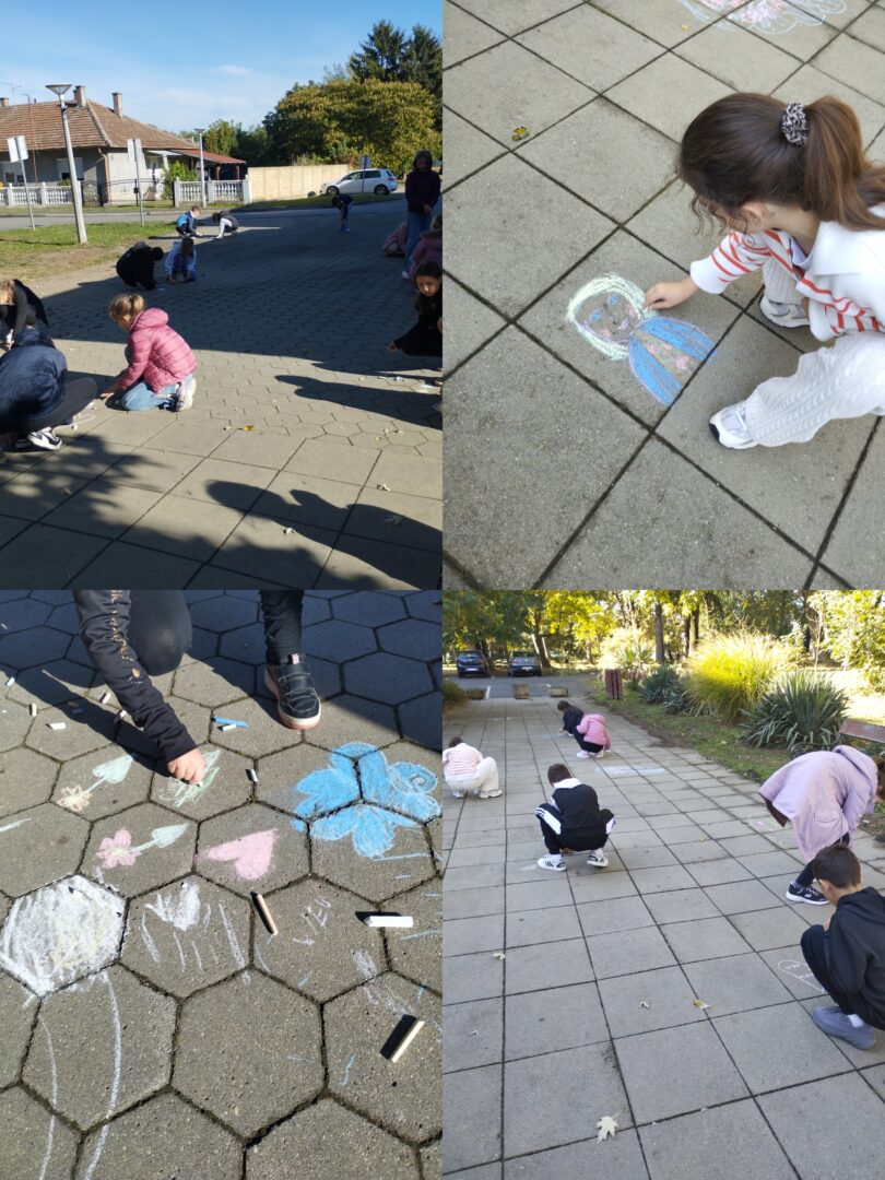 Kredama u boji oslikavali su školski pločnik ispred škole, izražavajući svoje misli, ideje i poruke o prijateljstvu, sreći i važnosti brige o mentalnom zdravlju.