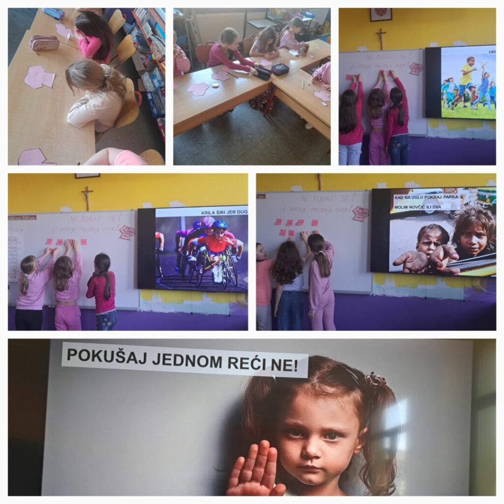 Učenice 3.a razreda i učiteljica Mihaela obilježile su Dan ružičastih majica kroz razgovor o važnosti prijateljstva i nenasilja. Pogledale su prezentaciju o oblicima nasilja , rješavale zadatke na listićima, izrađivale plakat te na kraju zapjevale prigodnu pjesmicu, šaljući poruku podrške i zajedništva.