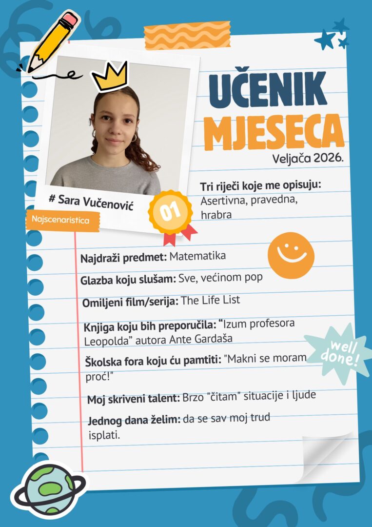 S velikim ponosom predstavljamo našu učenicu mjeseca, Saru Vučenović, koja se istaknula svojom kreativnošću, trudom i svestranošću.