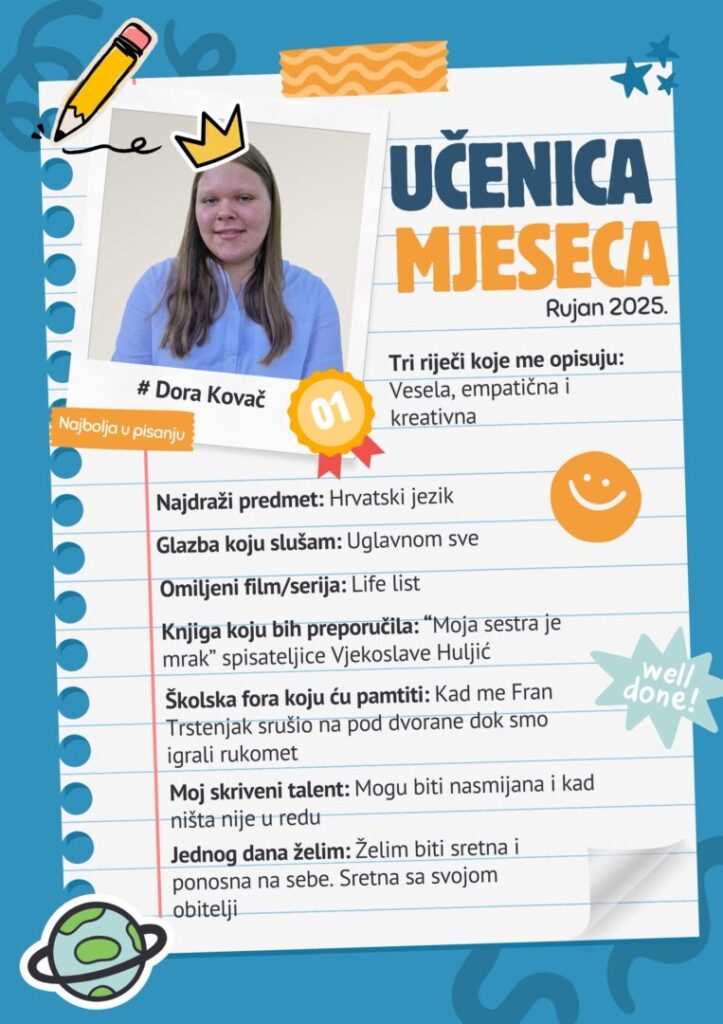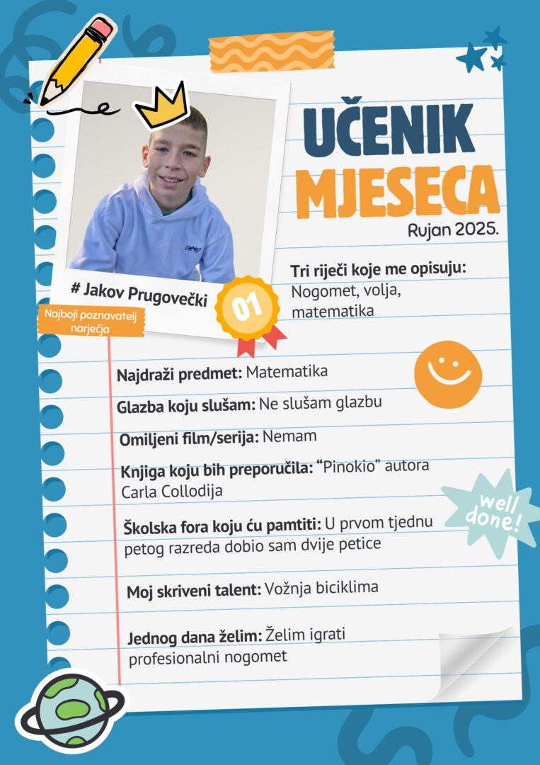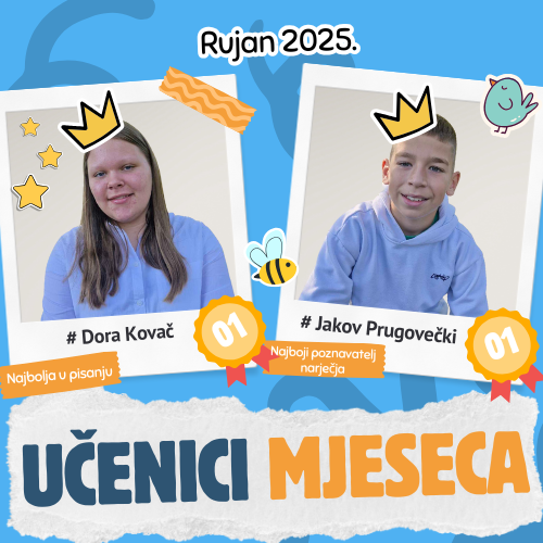 Već u prvom mjesecu izbora naišli smo na iznenađenje, dva učenika osvojila su jednak broj glasova! To samo pokazuje koliko su naši učenici vrijedni, marljivi i podržavaju jedni druge. Ovaj mjesec titulu učenika mjeseca ponosno nose Dora Kovač i Jakov Prugovečki. Čestitamo im na trudu, odgovornosti i lijepom primjeru koji pružaju svojim prijateljima u razredu i školi!