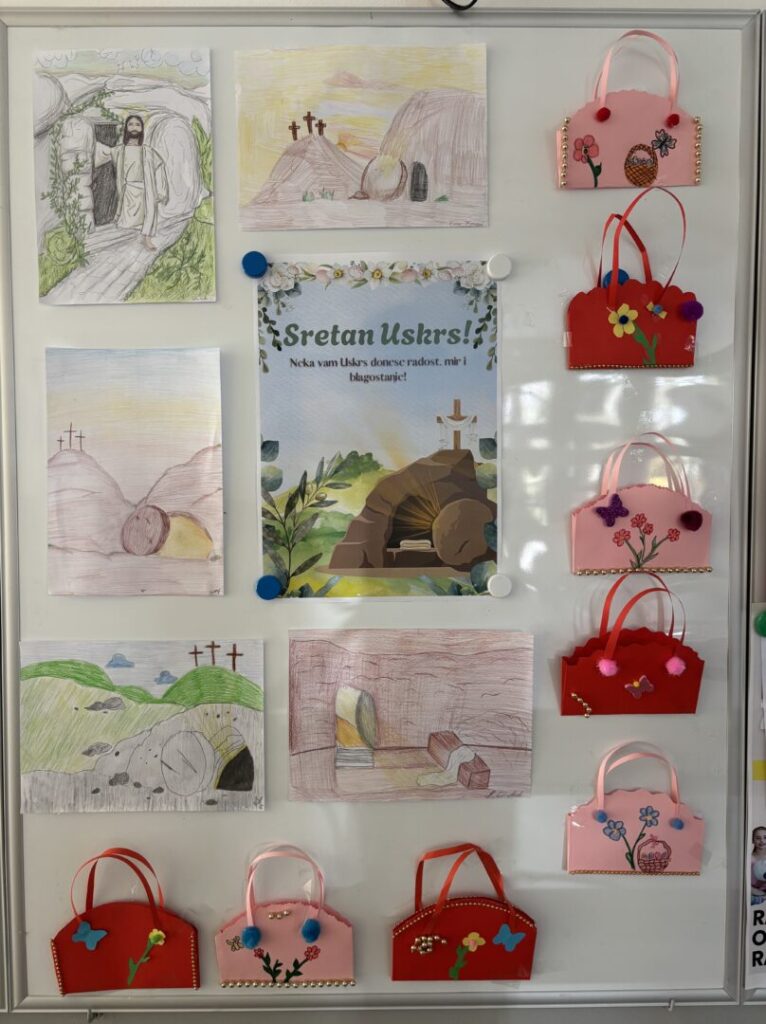 U susret najvećem kršćanskom blagdanu, Uskrsu, učenici izvannastavne aktivnosti „Domaćinstvo iz prošlosti“ zajedno s učenicima katoličkog vjeronauka vrijedno su radili na uređenju školskog panoa. Svojom kreativnošću i trudom unijeli su blagdanski ugođaj u školski prostor, ističući važnost tradicije, zajedništva i duhovnih vrijednosti koje Uskrs nosi.