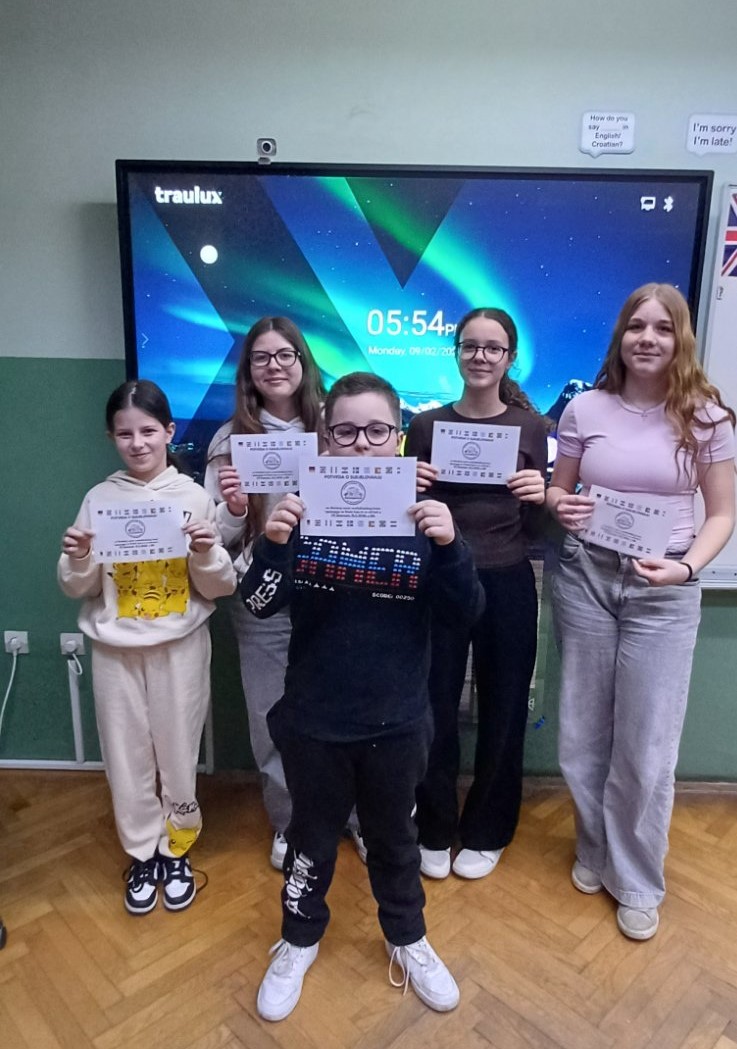 Pobjednička ekipa u sastavu Mikloš Kovač, Lucija Kajtazi, Lorena Špoljarec, Sara Vučenović i Renata Seleši osvojila je prvo mjesto te će imati priliku pokazati svoje znanje na međuškolskom natjecanju u svibnju, koje će se održati u Osnovnoj školi Šećerana.